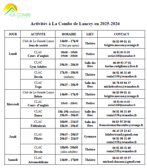 Activités 2025-2026 à La Combe de Lancey